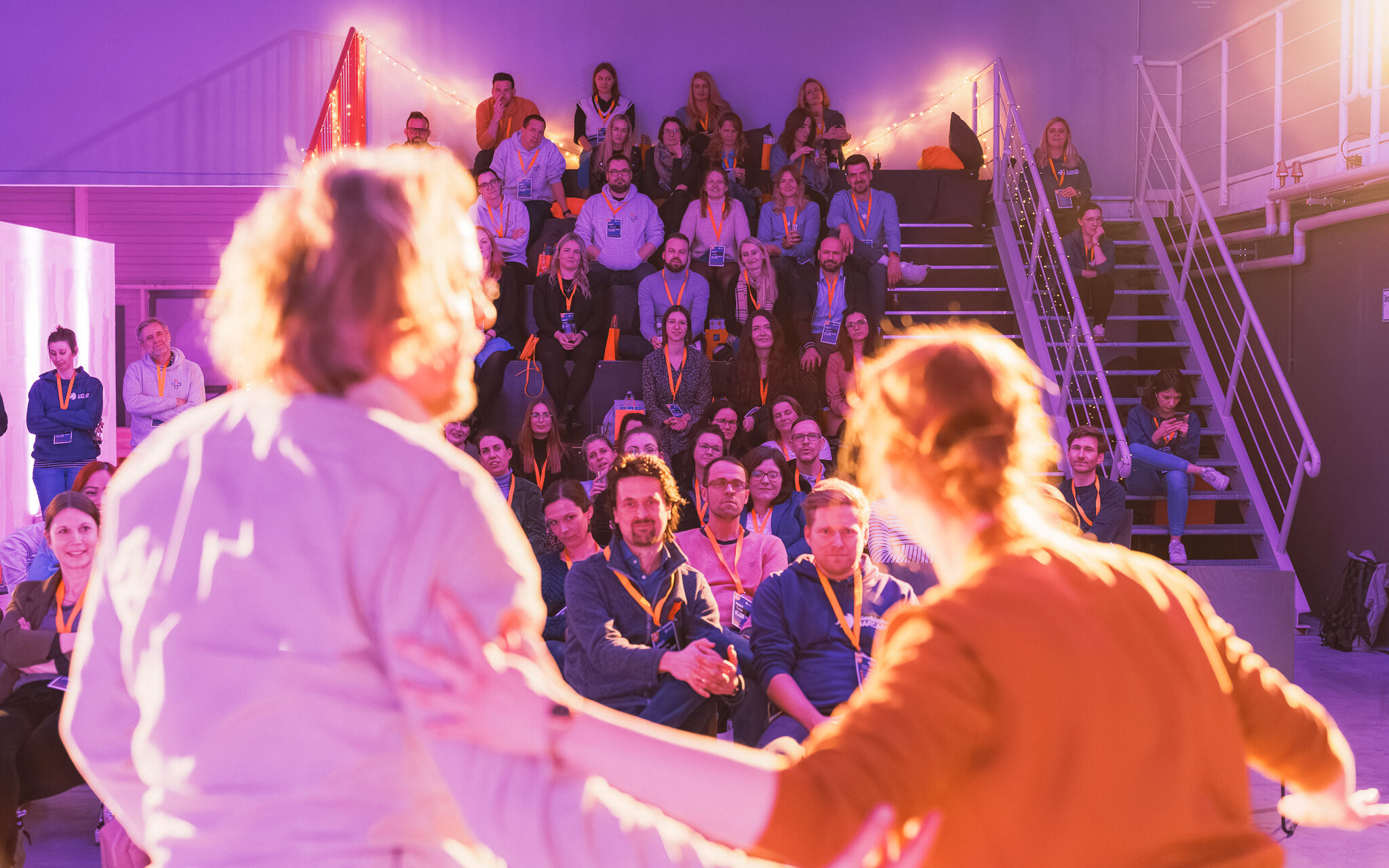 Vor dem Pitchen für einen der 16 Themen-Slots, die für den nächsten Tag zu vergeben waren, hatte die Steife Brise die Aufgabe, die Teilnehmenden zu aktivieren, sich für die Spots zu bewerben. Dies taten wir erfolgreich mit einem Mix aus Vortrag und Improvisationstheater.