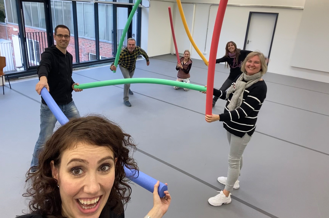 Es ist so wunderbar, wieder mit echten Leuten und in richtigem Kontakt Impro zu spielen! Echte Impro-Spiele, echte Impro-Szenen, echt viel Spaß. Mal ordentlich das Gehirn durchpusten, den Körper aktivieren und die Emotionen rauslassen. Ja, tatsächlich vergisst man vor lauter Spielfreude auch mal den Mindestabstand – prompt gibt es von den Trainer*innen einen Zwischenruf namens „ABSTAND!“ Oder die berühmten Pool-Nudeln kommen zum Einsatz, um den korrekten Abstand zu visualisieren.